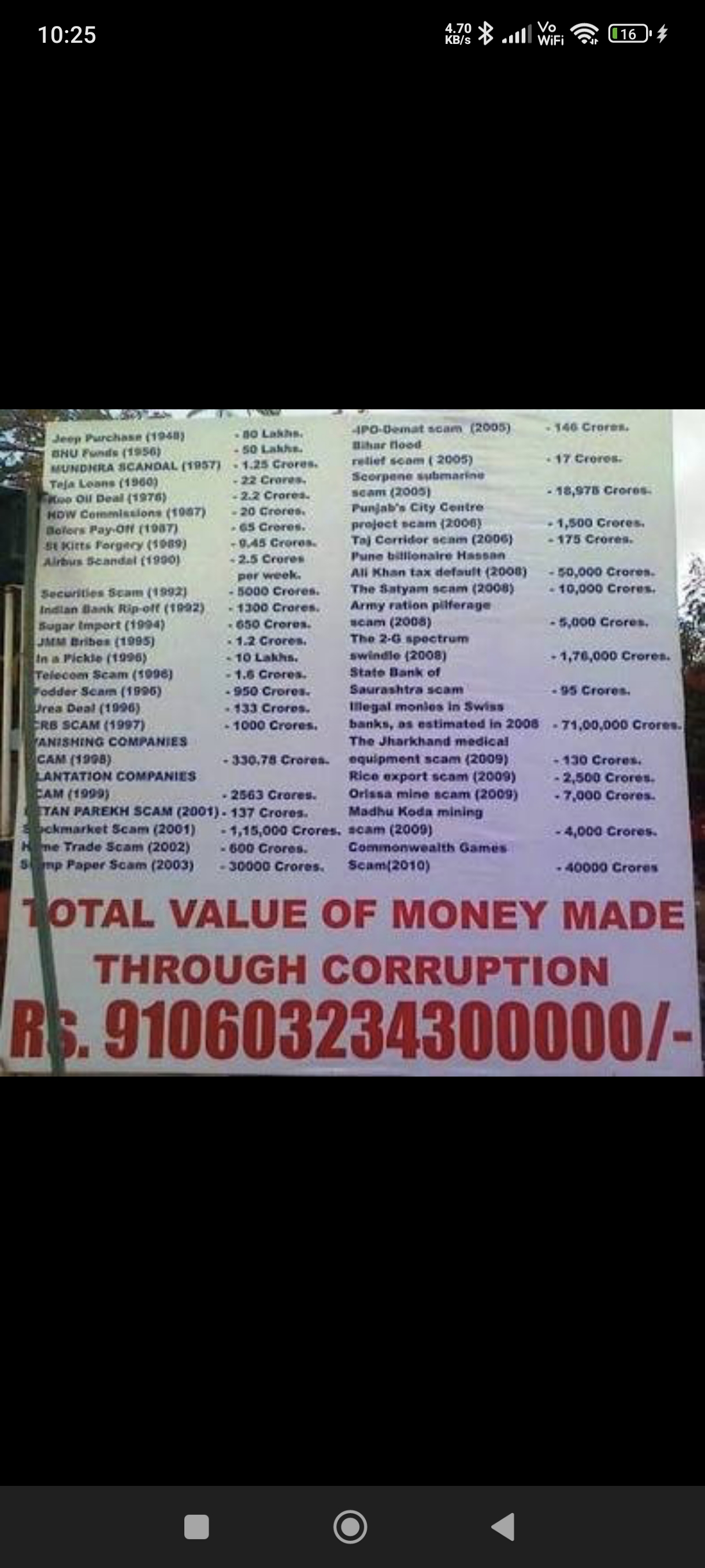 Here is the list of Congress important work!! A — Ardarsh Scam B — Bofors Scam C — CWG Scam D — Devas-Antrix Scam E — Employee Guarantee Scheme Scam F — Fodder scam, Food Security Bill Scam G — Ghaziabad Provident Fund Scam H — Harshad Mehta Stock Market scam, Hasan Ali Hawala Scam I — IPL Scam J — Junior Basic Trained Teachers’ Recruitment Scam K — Ketan Parekh Stock Market Scam L — LIC Housing Scam M — Madhu Koda Scam N — Non-banking Financial Companies Scam O — Oriental Bank Scam P — Punjab State Council of Education, Research and Training Scam Q — Quest for Gold Scam R — Ration Card Scam, Rafale Jet Fighter Procurement Scam S — Satyam Scam, Fire Prone Submarine Scam T — Telecom 2G Scam, Temple Collection Scam, Congress President Travel Budget Scam U — UTI Scam, UBS Illegal Accounts Scam V — Volkswagen Equity Scam, Vadra DLF Scam W — West Bengal Telecom Scam, Westland Helicopter Scam please say that congress was Developing nation