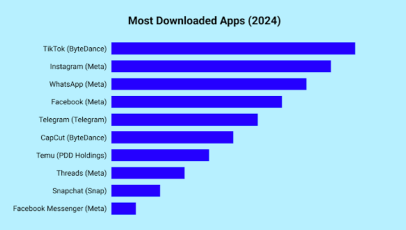 with download and hour The most downloaded apps in 2024 and their average daily usage are: 1. TikTok - Downloads. : 672 million - Daily Usage. : 90 minutes 2. Instagram. - Downloads. : 767 million - Daily Usage. : 53 minutes 3. WhatsApp - Downloads. : 5 billion+ - Daily Usage. : 30 minutes 4. Telegram - Downloads. : 310 million - Daily Usage. : 25 minutes 5. Facebook - Downloads. : 139.9 million (H1 2024) - Daily Usage. : 33 minutes These apps dominate in both downloads and user engagement.
