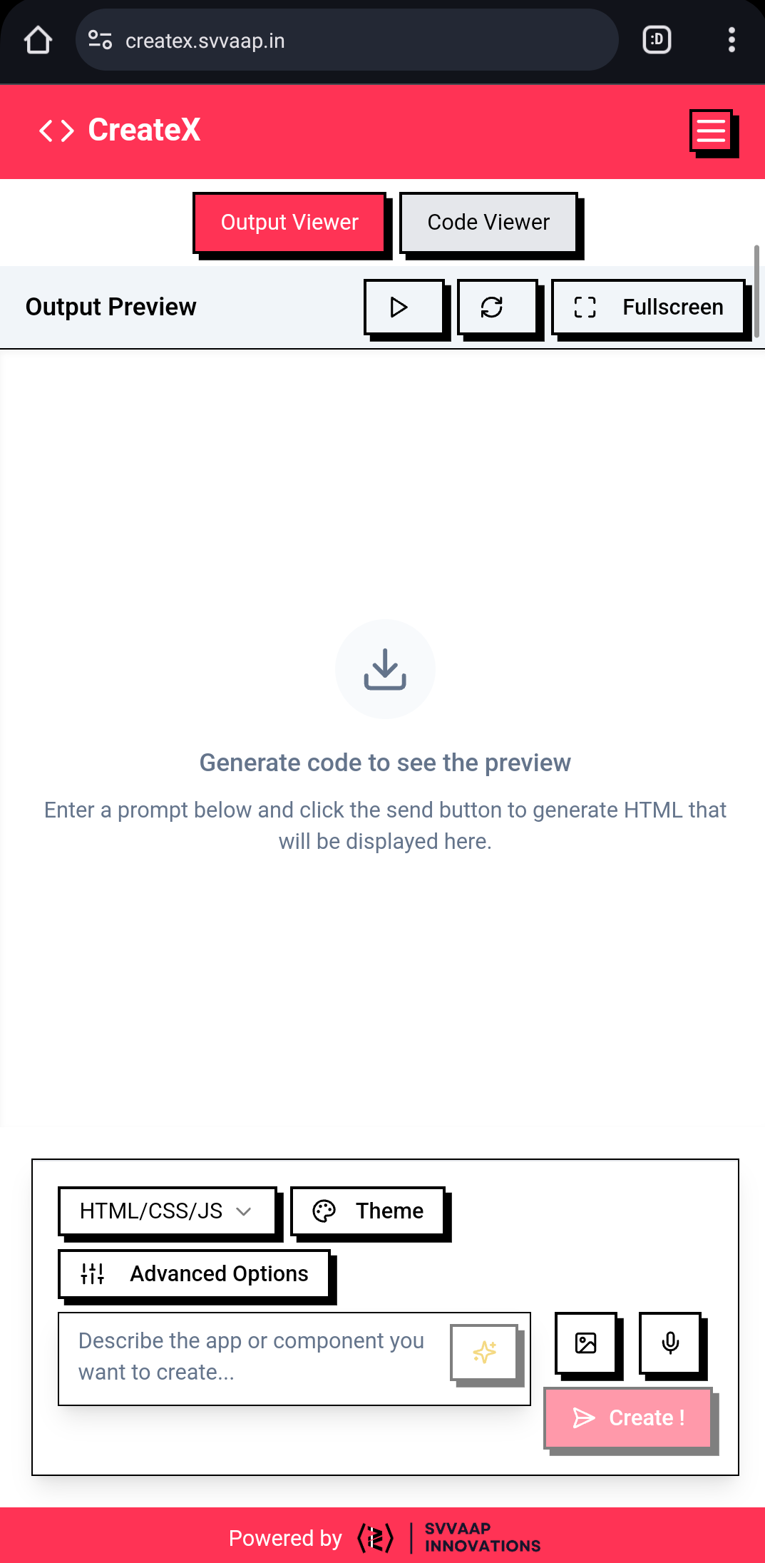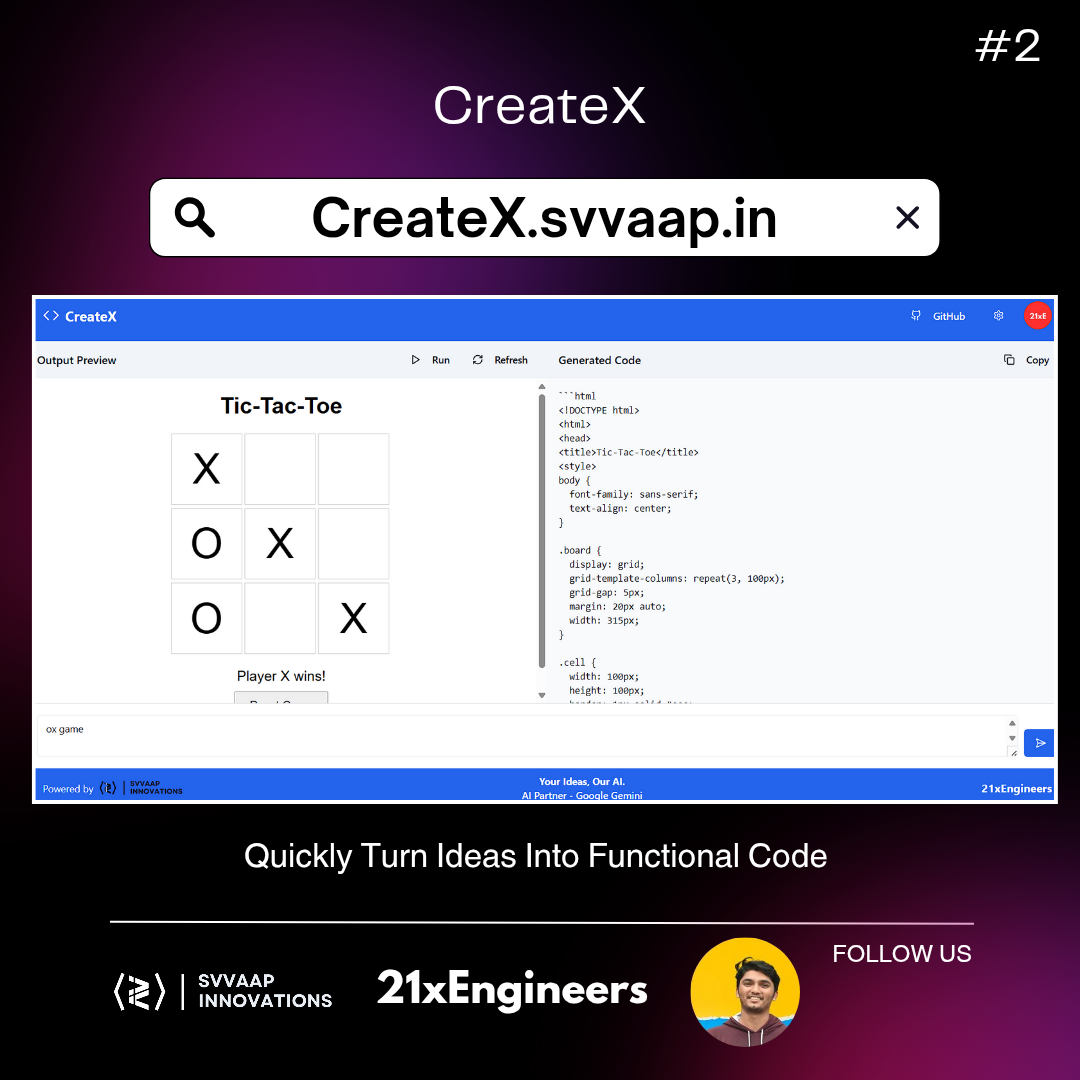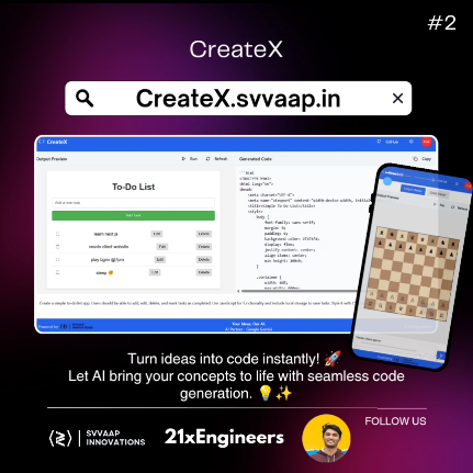 Turn your ideas into code instantly! 🚀 Just describe your concept, and CreateX AI will generate the code for you—fast, smart, and hassle-free. Try it now! 🚀 CreateX Update! Now build smarter & faster with: 🖼️ Image to Code 🎨 Figma to Code 🎙️ S