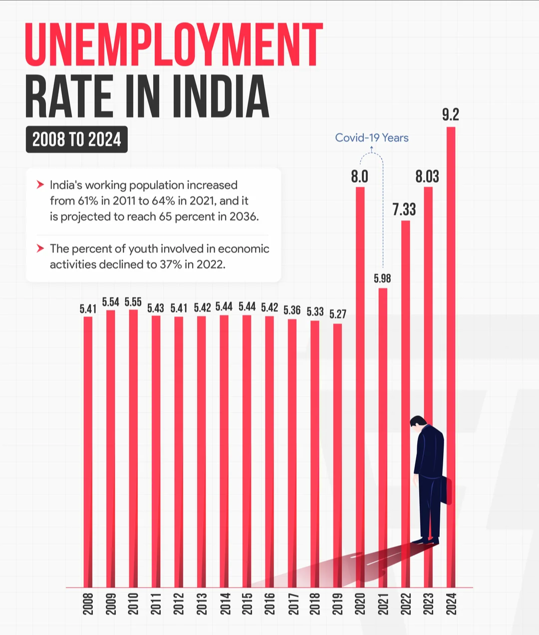 Unemployment rate in India - From 2008 to 2024 Iโve observed that a significant number of young people today are caught up in distractions like endlessly scrolling reels, consuming explicit content, playing video games, and wasting time on meaningless gossip. On top of that, many unemployed individuals spend their days on social media, often spreading negativity, using abusive language, and creating unnecessary hatred. This constant cycle of unproductive behavior not only affects their mindset but also builds a toxic environment online. Instead of focusing on personal growth, developing skills, or pursuing meaningful goals, theyโre stuck in this loop that ultimately harms their future. The lack of direction and purpose is evident, and over time, it starts reflecting in their attitude, relationships, and lifestyle. Whatโs even more worrying is how this normalizes negativity and unproductive habits, making it harder for them to break free and build something meaningful for themselves.