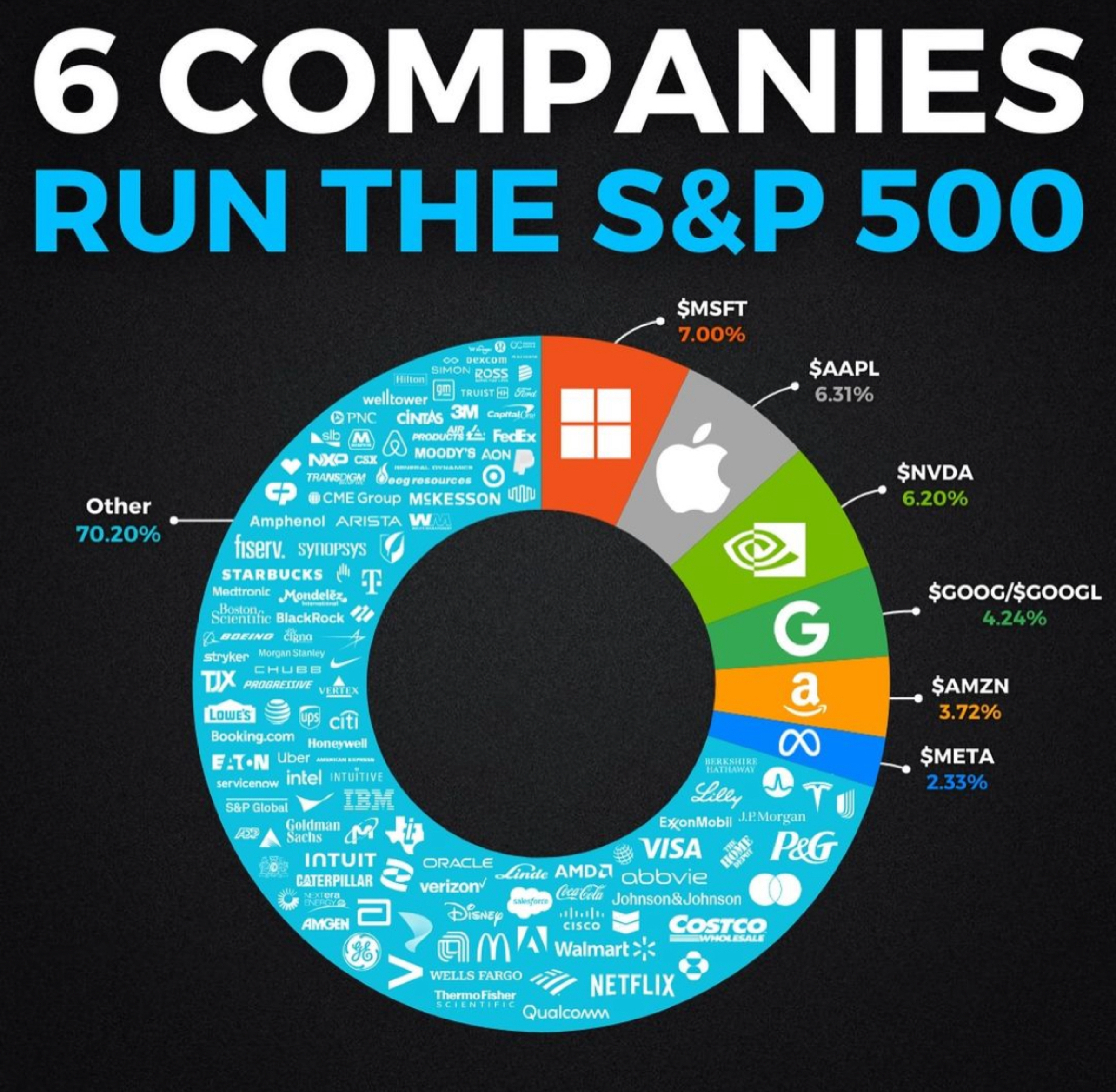 The S&P 500 companies distribution is crazy! 29.8%—that's the slice of the S&P 500 pie taken up by its top 6 holdings now This is up from 26% at the start of the year, and is largely fueled by Nvidia's astounding rally. The Al chip maker has shot u