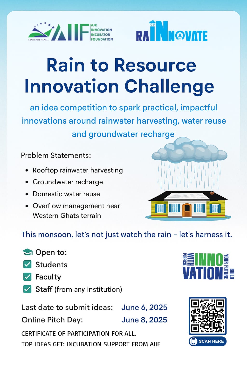 RAINOVATE 2025 – Innovation Challenge by AIIF 💧🌿 This monsoon, don’t just watch the rain — harness it! 🎯 Challenge Focus Areas: 🔹 Rooftop Rainwater Harvesting 🔹 Groundwater Recharge 🔹 Domestic Water Reuse 🔹 Overflow Management near Western Gh