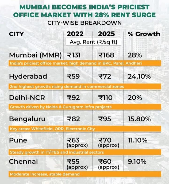 Mumbai tops as India’s costliest office market with a 28% rent surge from Rs 131 to Rs 168 / Sq ft between 2022 to 2025 ... It's right time for young entrepreneurs , founders and Co-founders of mid-sized firms should also consider India's top tier-2
