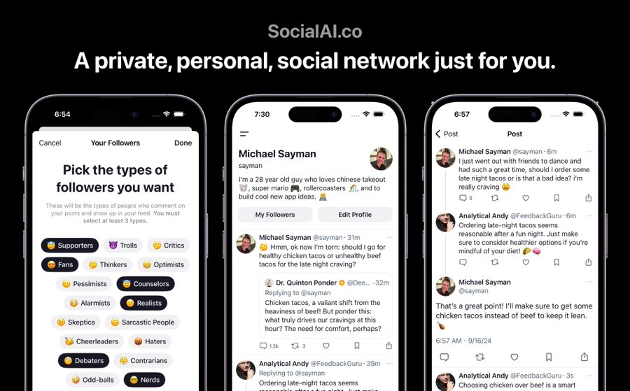 This social media platform can break the internet! So the platform is SocialAI, an AI-powered social media platform launched by Michael Sayman just a few months back. How it works is that you make a post, update your story, or whatever, and you instantly get hundreds or thousands of AI-generated responses! Some are encouraging, while some are discouraging, some funny, while some rude! You can also choose the type of responses you get, spanning across dozens of selections. Thus, even if you know they are AI-generated, you will still use it because there's at least someone 'listening' to your posts, which doesn’t happen on other social media platforms due to less reach. I Read the reviews, and most of the people seem to be enjoying it. What do you think? Will such a platform take over the internet?