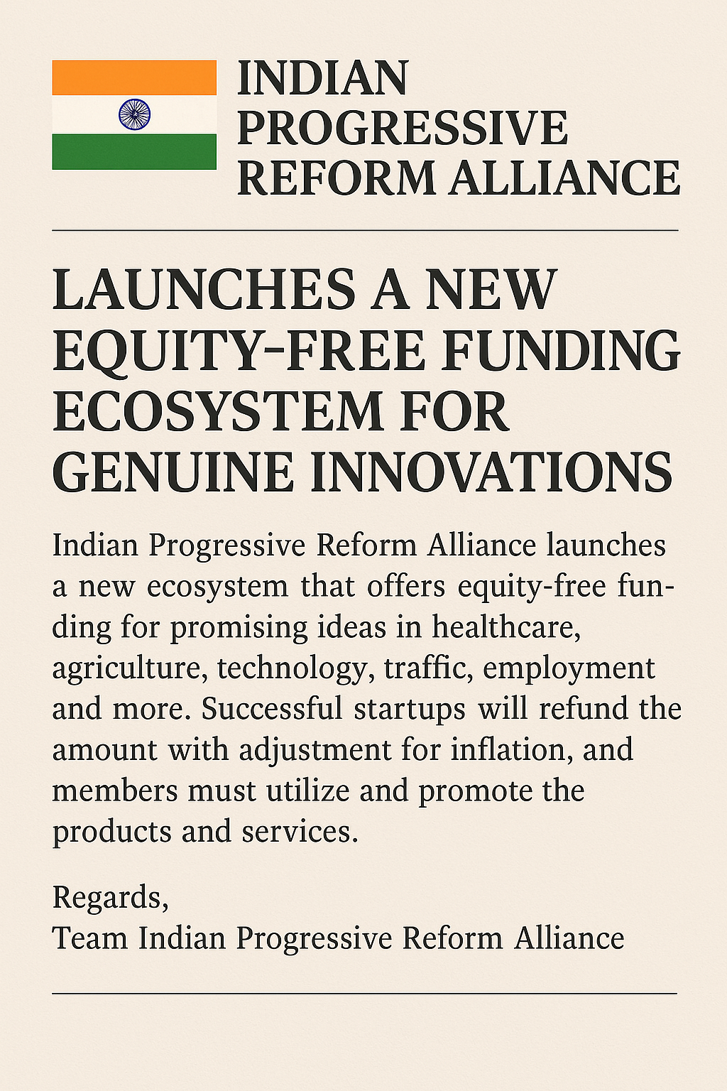 INDIAN PROGRESSIVE REFORM ALLIANCE LAUNCHES A NEW EQUITY-FREE FUNDING ECOSYSTEM FOR GENUINE INNOVATIONS New Delhi, April 5, 2025 – In a bold and transformative move, a new national initiative titled Indian Progressive Reform Alliance (IPRA) has been
