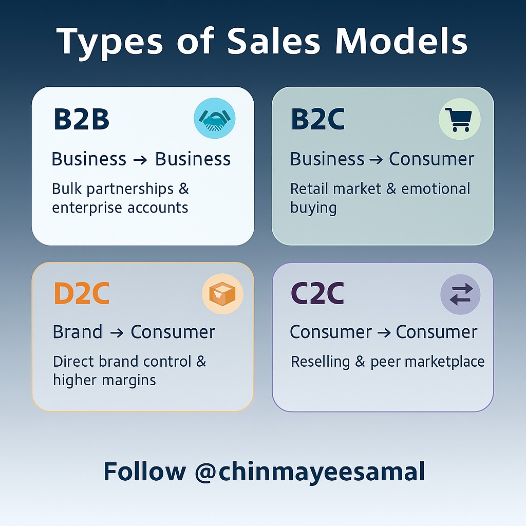 🚀 Understanding Sales Models = Unlocking Business Growth Every brand scales differently — and knowing the right sales model helps you choose smarter strategies, better channels & bigger opportunities. ✨ Types of Sales Models 🔹 B2B – Business → Bu