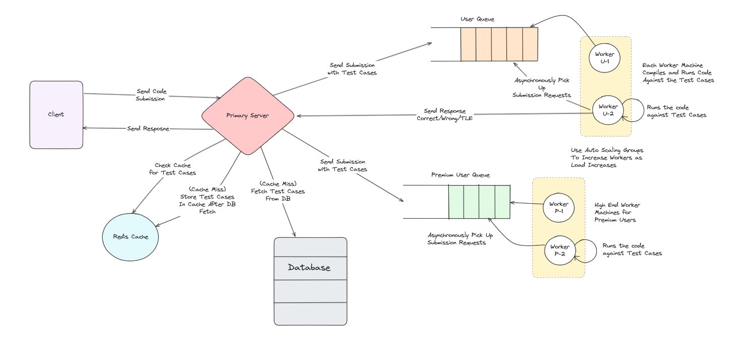 LeetCode System Design Here's my take on a leetcode type platform's system design - Queues for async processing - Autoscaling workers to handle peak loads - Redis as cache