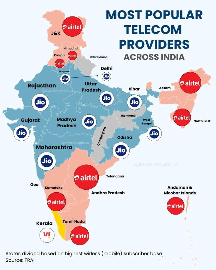 While Jio holds the highest number of subscribers nationwide, the state-wise telecom dominance across India tells a more nuanced story. In Central India, Jio has near-complete coverage. However, Airtel takes the lead in several key regions, particul