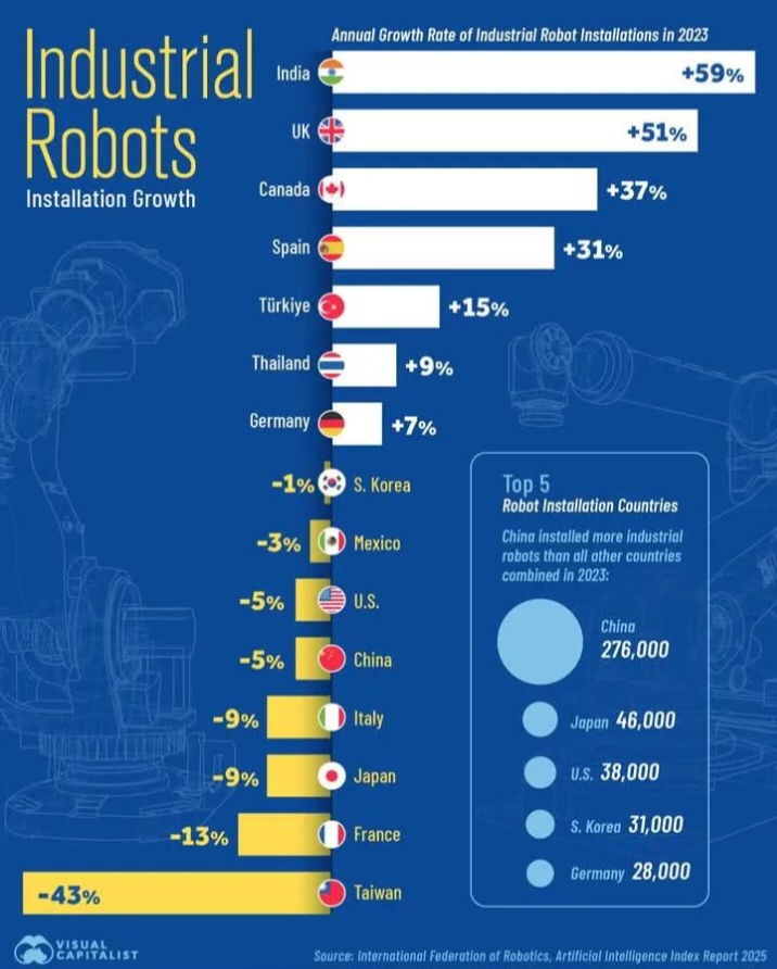 India now ranks 7th globally in annual robot installations .. Globally, there were nearly 4.3 Million operational industrial robots in 2023, with China installing 276,300 that year alone. While , India has seen the fastest annual growth in industri