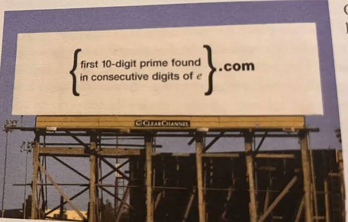 Google's Clever Trick to Attract Employees! In 2004, Google placed a billboard on Highway 101 in Silicon Valley with a simple yet fun challenge: "Find the first 10-digit prime number in consecutive digits of e and Visit [that number].com." This le