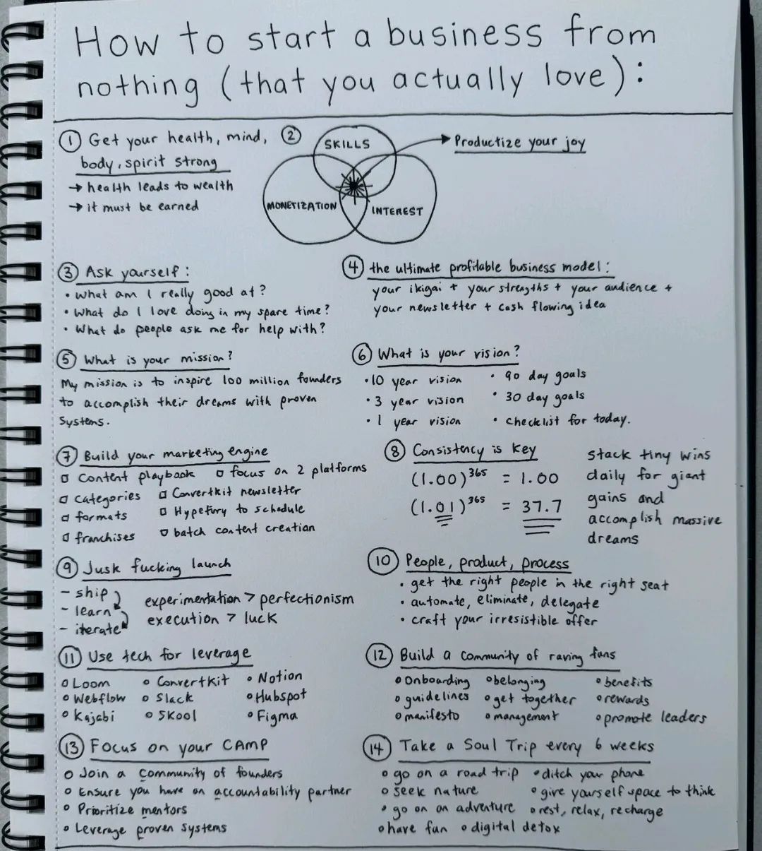 Starting a business from scratch might seem tough, but these 14 steps ๐ช can guide you on a journey youโll love. 1. Prioritize Health๐ช Build a strong body and mind for lasting success. 2. Discover Your Talents๐ฆธโโ๏ธ What are you good at, and what