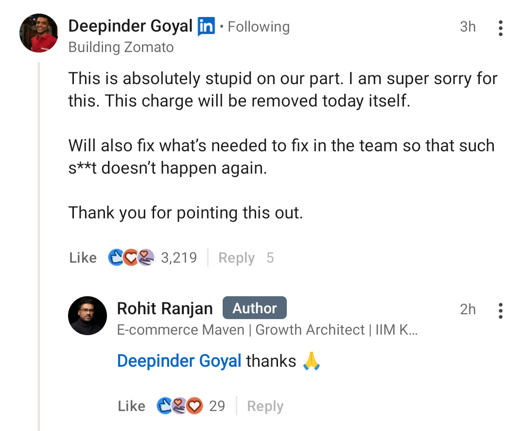 Zomato is really quick in decision making 🚀 A user on LinkedIn expressed his concern towards a new fee -- "veg mode enablement fee" and here's what Zomato's CEO Deepinder Goyal answered.