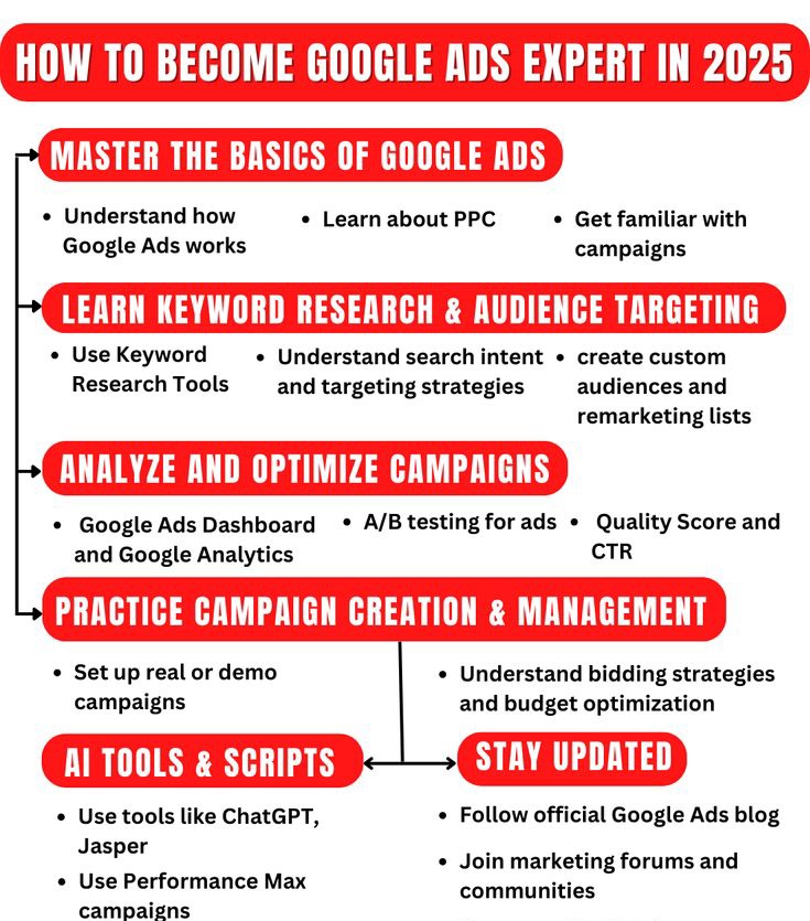 How to Become #GoogleAdExpert In 2025:- 1. Master the Basics of Google Ads 🧠 Understand how Google Ads works 💸 Learn about PPC (Pay-Per-Click) 🧪 Get familiar with campaigns 2. Learn Keyword Research & Audience Targeting 🔍 Use Keyword Researc