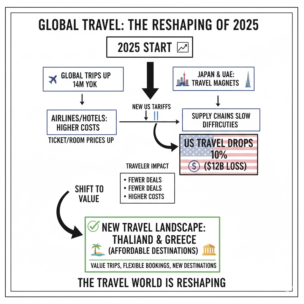 Global travel isnโt dying. Itโs just moving. 1. 2025 started strong. Global trips were up by 14M YOY (year over year). People were traveling again after the pandemic, and places like Japan and the UAE became major travel hotspots. 2. Then came new
