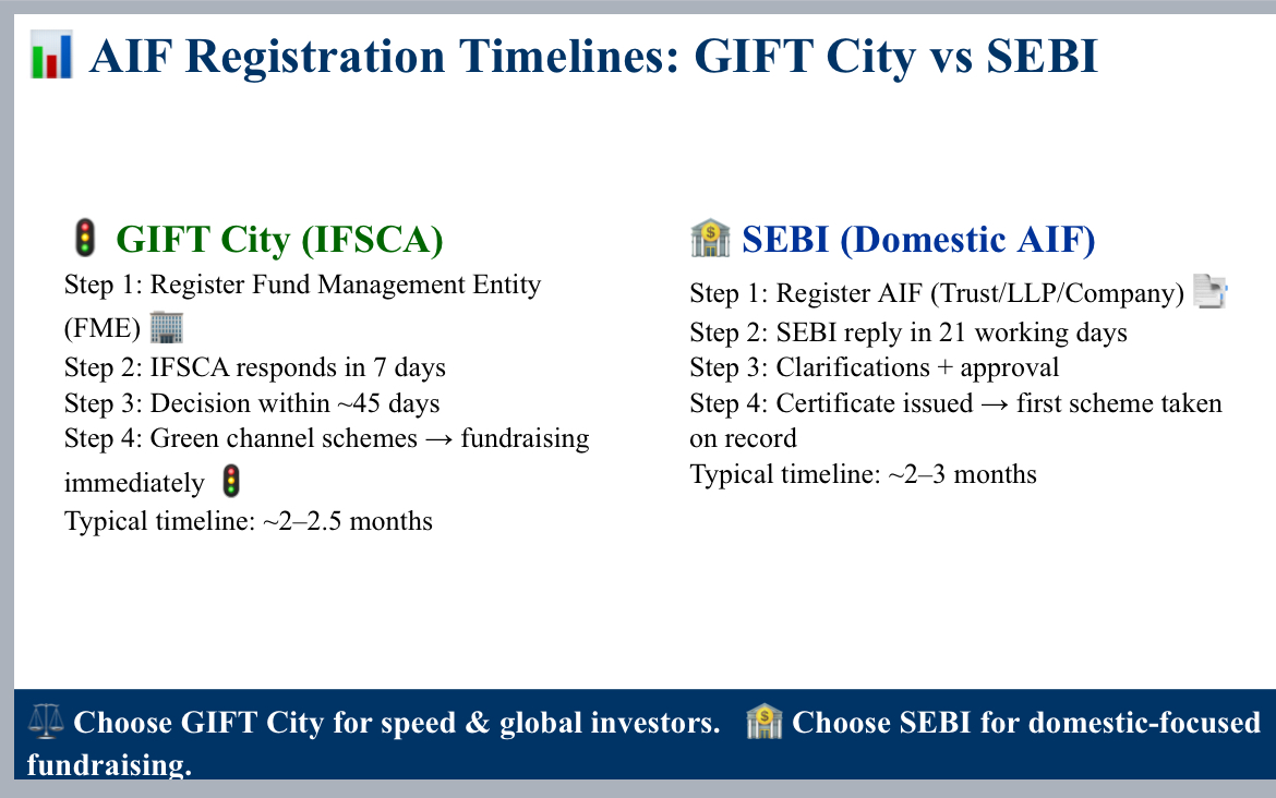 Quick 1-minute breakdown: How long does AIF registration take in GIFT City (IFSCA) vs onshore India (SEBI)? Learn the stepwise process, timelines and practical market expectations โ FME-first approach in GIFT City with a 7-day acknowledgement and dec