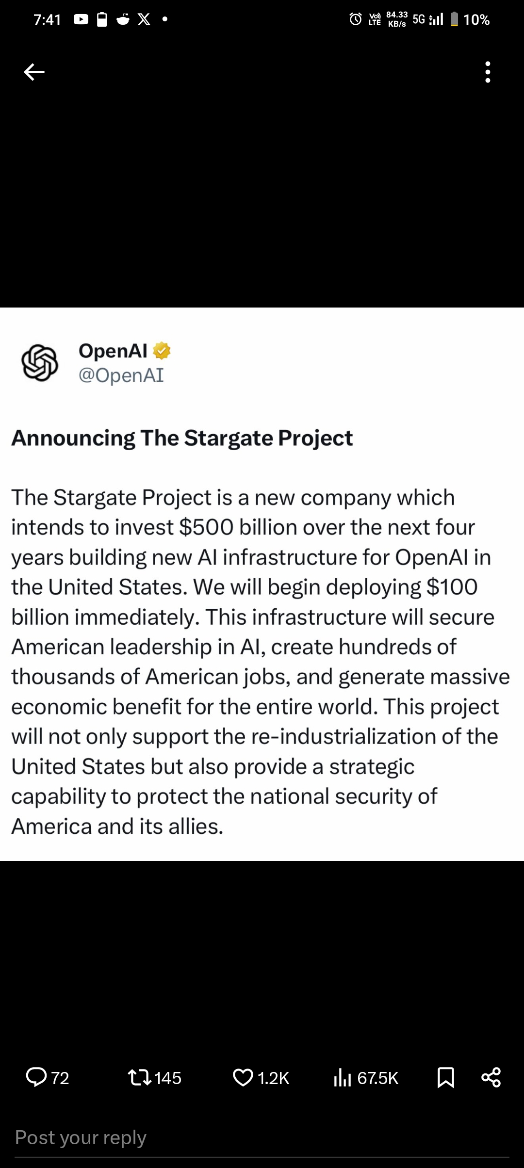 The Stargate Project : The Stargate Project is investing $500 billion over four years to build AI infrastructure for OpenAI in the U.S., starting with $100 billion. This initiative will bolster American AI leadership, create hundreds of thousands o