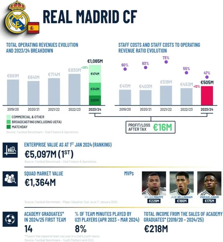 Real Madrid: A €1B Powerhouse 💰 €1.065B in revenue (+28% YoY). 📉 Staff costs at 47% of revenue. 🌍 €5.1B valuation—#1 globally. ⚽ €218M from academy sales in 5 years. A masterclass in brand, innovation, and strategy.