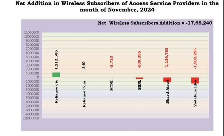 In the Month of November 2024 Jio Gained 1.2 Million Subscribers MTNL Lost 2170 Subscribers BSNL Lost 3 Lakh Subscribers Airtel Lost 1.1 Million Susbcribers Vodafone Idea Gained 1.5 Million Subscribers