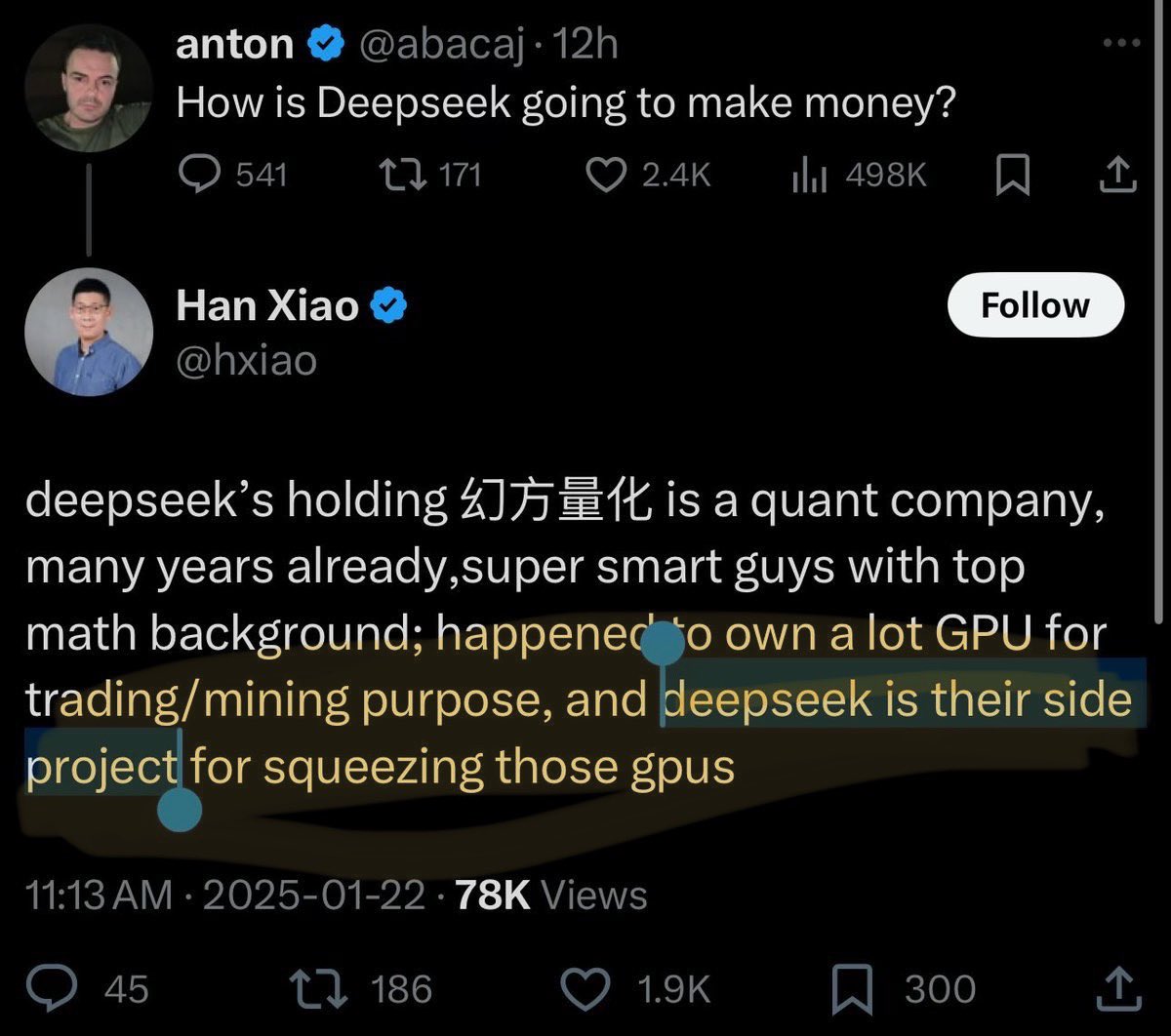 Silicon Valley is shaking. So, Deepseek has now reached No 1 spot on the App Store beating Chatgpt. A โside-projectโ, with $6M against a company worth multiple billions. Itโs Open Source and 95% cheaper too. The AI bubble is bursting and the moat
