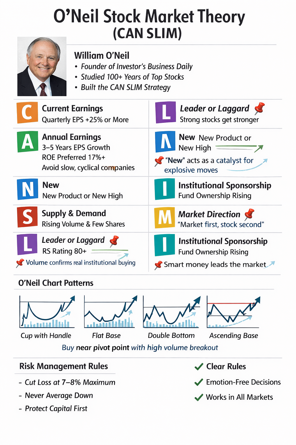 O’Neil CAN SLIM Strategy (Quick Explainer) C = Strong current earnings A = Consistent annual growth N = New product or new high S = Supply & demand L = Market leaders I = Institutional support M = Market trend ⚠️ Educational only. No investment adv