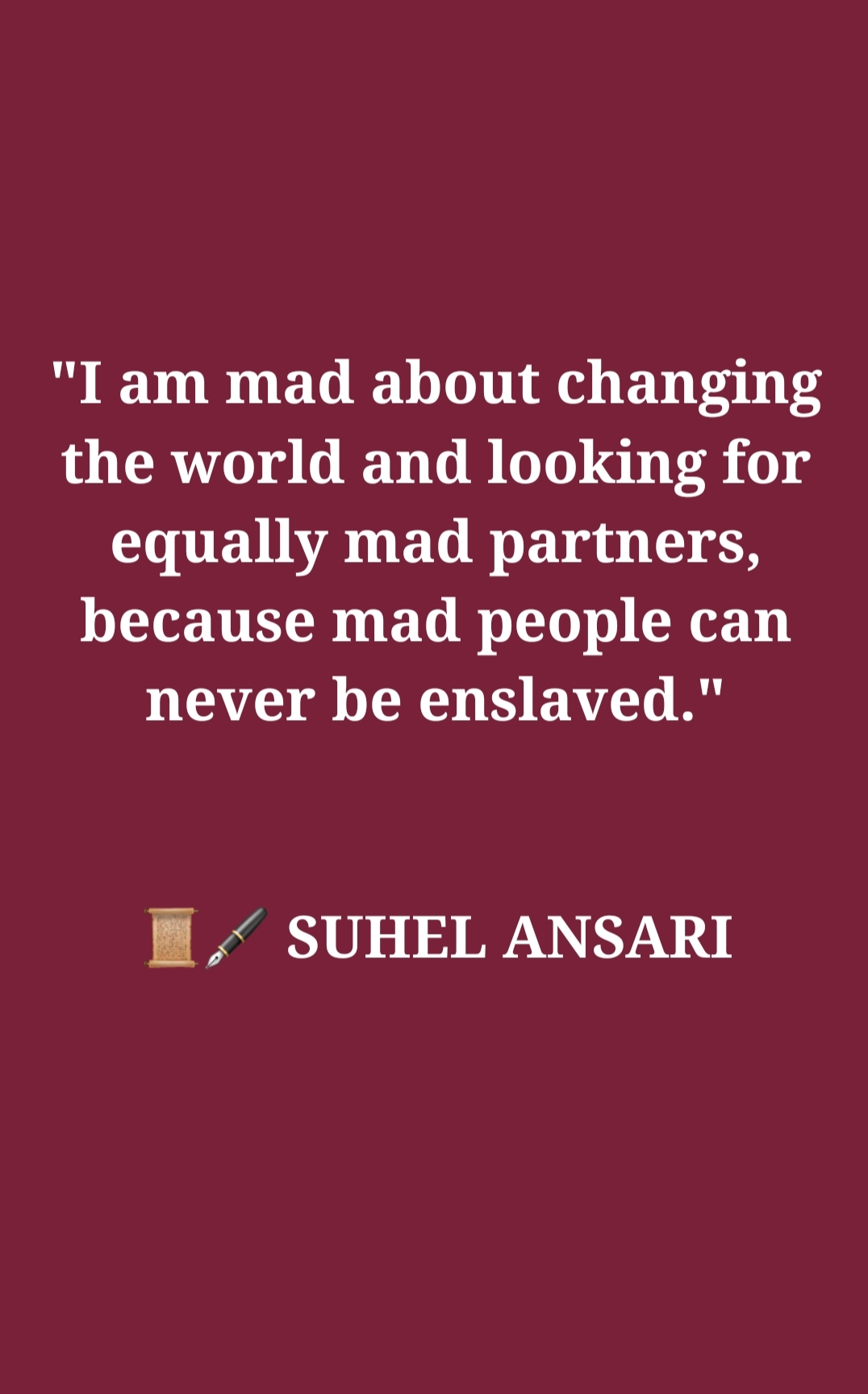 "I am mad about changing the world and looking for equally mad partners, because mad people can never be enslaved."