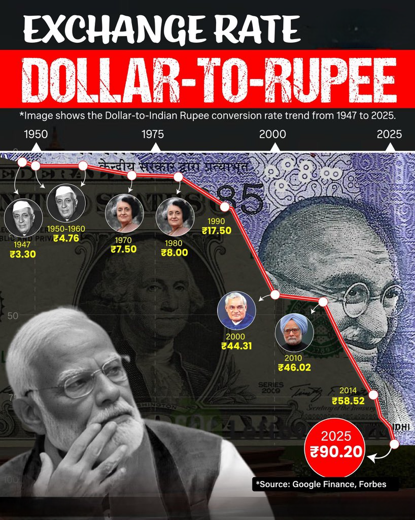 📉💰 DOLLAR vs RUPEE – 78 Years of Change! From ₹3.30 in 1947 to ₹90.20 in 2025, the journey of the Indian Rupee tells a powerful story of our economy, global markets, and policy decisions. 🇮🇳 Leaders changed… 🌍 Global conditions shifted… 📊 But