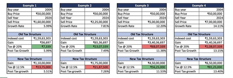 New Property Taxation Scenarios: 1) Modest Gains, High Burden 2004 Buy Price: โน50 lakh 2024 Sell Price: โน1.6 crore Old Taxation: โน7,339 New Taxation: โน13.75 lakh Your tax liability jumps from โน7,339 to โน13.75 lakh!!! 2) Moderate Gains, Heavier Lo