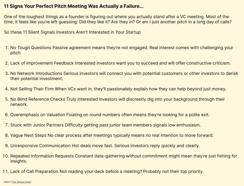 11 Hidden Signs Investors aren’t Interested in Your Startup 👇 One of the toughest things as a founder is figuring out where you actually stand after a VC meeting. Most of the time, it feels like you’re left guessing: Did they like it? Are they in? Or am I just another pitch in a long day of calls? The truth is, investors rarely say “no” outright. Instead, they drop subtle signals that most founders miss. Polite nods, vague enthusiasm, or even a lack of pushback can often mean they’ve already decided to pass. So here are 11 subtle (but telling) ways investors signal they’re not going to invest: ➞ No Pushback or Hard Questions If an investor isn’t challenging your idea or asking tough questions, they’re probably not seriously considering it. Good investors want to test your assumptions. ➞ No Feedback on How to Improve When investors are genuinely interested, they’ll often offer constructive feedback to help refine your pitch or product. Silence? Not a good sign. ➞ No Introductions to Their Network Warm intros to other investors or potential customers are a clear indicator of interest. If they’re not helping you connect the dots, they’re likely not serious. ➞ Not Selling You on Their Firm Excited investors will pitch themselves—their network, resources, or how they’ll support you. If they’re not hyping their value-add, they probably don’t think they’ll need to. ➞ No Reference Checks or Diligence Investors who are leaning toward writing a check often dig deeper by talking to people in your network, especially references you didn’t provide. ➞ Overemphasis on Valuation If an investor is obsessing over valuation, it’s often a polite way to walk away. When they really want in, they’ll find a way to make it work. ➞ You Can’t Get Past Junior Partners If the decision-makers aren’t getting involved, or if a GP hands you off to a junior partner without follow-up, it’s a sign they’re not fully bought in. ➞ No Clear Next Steps After the Meeting Serious investors will lay out next steps and timelines. If they’re vague about what happens next, it’s probably because… nothing is happening next. ➞ Unresponsiveness or Vague Replies Hot deals move fast. If an investor drags their feet responding to emails or schedules calls weeks out, they’re not prioritizing your deal. ➞ Repeated Requests for Info Sometimes, investors will keep asking for data without moving closer to a decision. Worst-case? They’re fishing for insights to evaluate another startup. ➞ Lack of Preparation for the Call If an investor hasn’t read your deck or done any research before the meeting, it’s a sign they’re not super excited. Spotting these signals can save you time and energy. Focus on investors who genuinely believe in your vision, not lukewarm leads. These aren’t hard rules, but they’ll help you fundraise smarter and protect your emotional bandwidth. Credits: Sahil S/linkedin