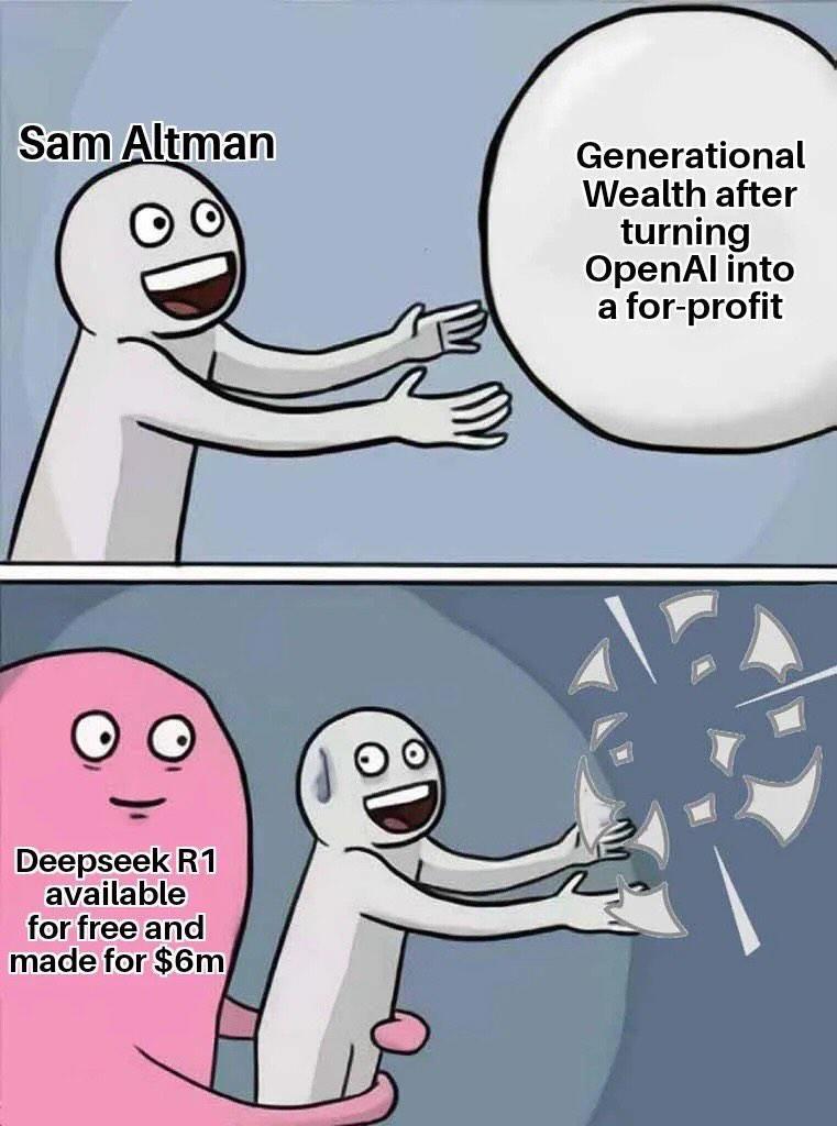 Silicon Valley is shaking. So, Deepseek has now reached No 1 spot on the App Store beating Chatgpt. A โside-projectโ, with $6M against a company worth multiple billions. Itโs Open Source and 95% cheaper too. The AI bubble is bursting and the moat