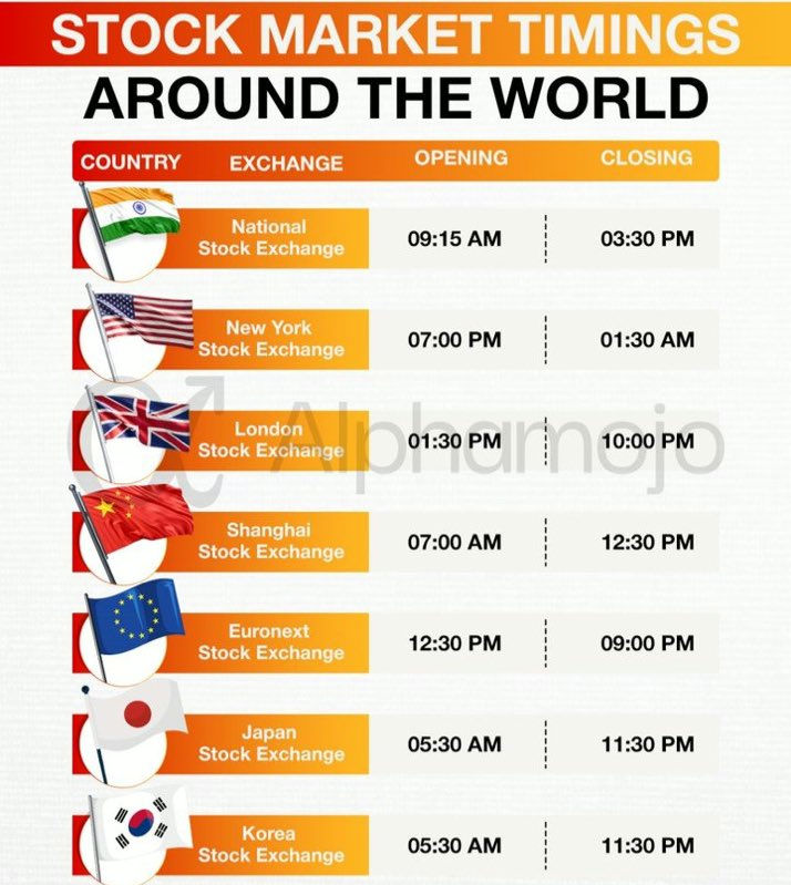 Stock Market Timings Around the World Ever wondered when the worldโs biggest stock exchanges open and close? ๐ Hereโs a quick guide to help you track the markets across countries whether youโre into NSE, NYSE, London, Shanghai, Euronext, Tokyo, or