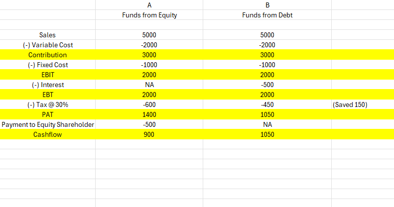 Equity vs. Debt - What’s Better for Business Funding? 🤔 Let’s break it down with a simple example: Both scenarios (A & B) start with the same revenue and cost structure. But there's one key difference - the funding source. Scenario A: Funded ent