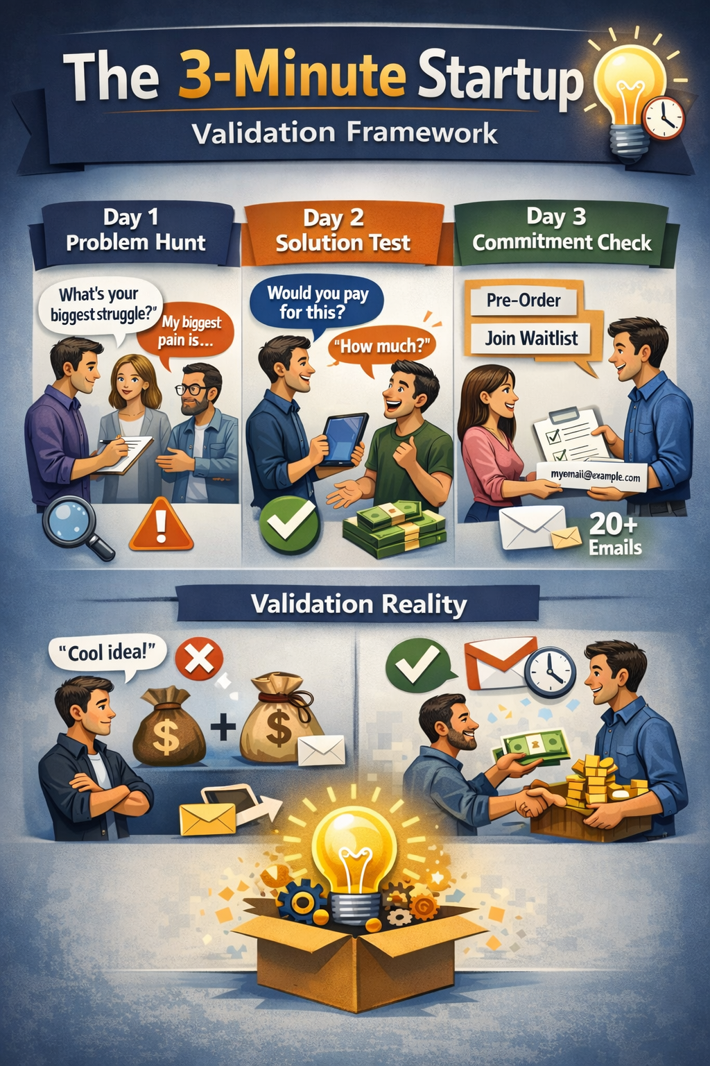 🎯 The 3-Minute Startup Validation Framework Most founders waste 6 months building. Here's how to validate in 3 days: Day 1: Problem Hunt • Talk to 10 people in your target audience • Ask: "What's your biggest struggle with [X]?" • Red flag: If t
