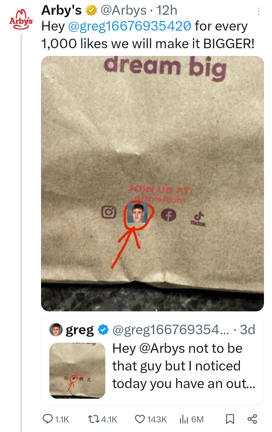 This is what we call Viral Marketing! So It all started when Greg, a popular X creator, tagged Arby’s (an American QSR brand), pointing out that they still hadn't updated the old ‘Twitter logo’ on their carry bag. To this Arby’s humorously replaced the Twiiter logo with Greg’s profile picture and promised that for every 1,000 likes, they’d make Greg’s face bigger on the packaging. And while they will probobly never do that, this stunt still worked as 1. Their X post’s views shot up 750x, from 8K to 6 million. 2. At peak, interest in Arby’s surged over 100x (as per Google Trends). And All this free organic marketing—without spending a penny on ads.