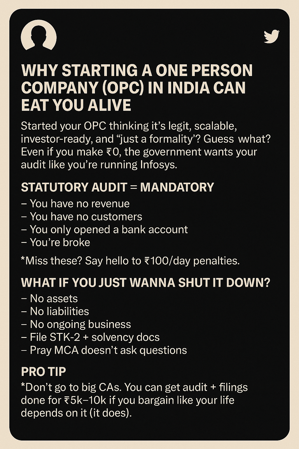 Starting a Company in India Can Eat You Alive — Even if You’re Broke Tag your CA friends, they’ll cry too. Started an OPC thinking it's "just a formality"? Even if you made ₹0, the govt wants an audit like you're Infosys. Statutory Audit = Manda