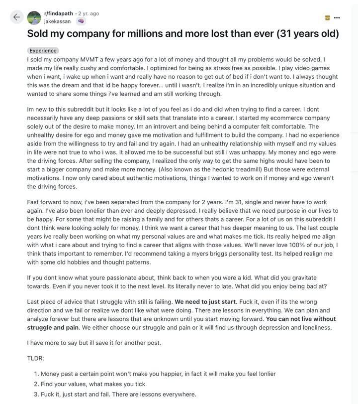 A 31yr old guy who sold his startup for $100 million shares why hes depressed and how to approach your career/life
