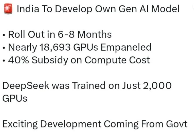 India to build its own foundational AI model 🔥 The foundational models made in India will be able to compete with the best of the best in the world,” electronics and information technology minister Ashwini Vaishnaw said at a press briefing on Thursday. “With algorithmic efficiency, we can create these models in a much shorter time frame. We will have a world-class foundational AI model in just a few months. The GPUs will be supplied by 10 private sector companies including Yotta Data Services, Tata Communications, CMS Computers, E2E Networks, Jio Platforms and NxtGen Datacenter. These companies have between themselves secured 12,896 Nvidia H100 GPUs, 1,480 Nvidia H200 GPUs, and 742 MI325 and MI325X GPUs from AMD.