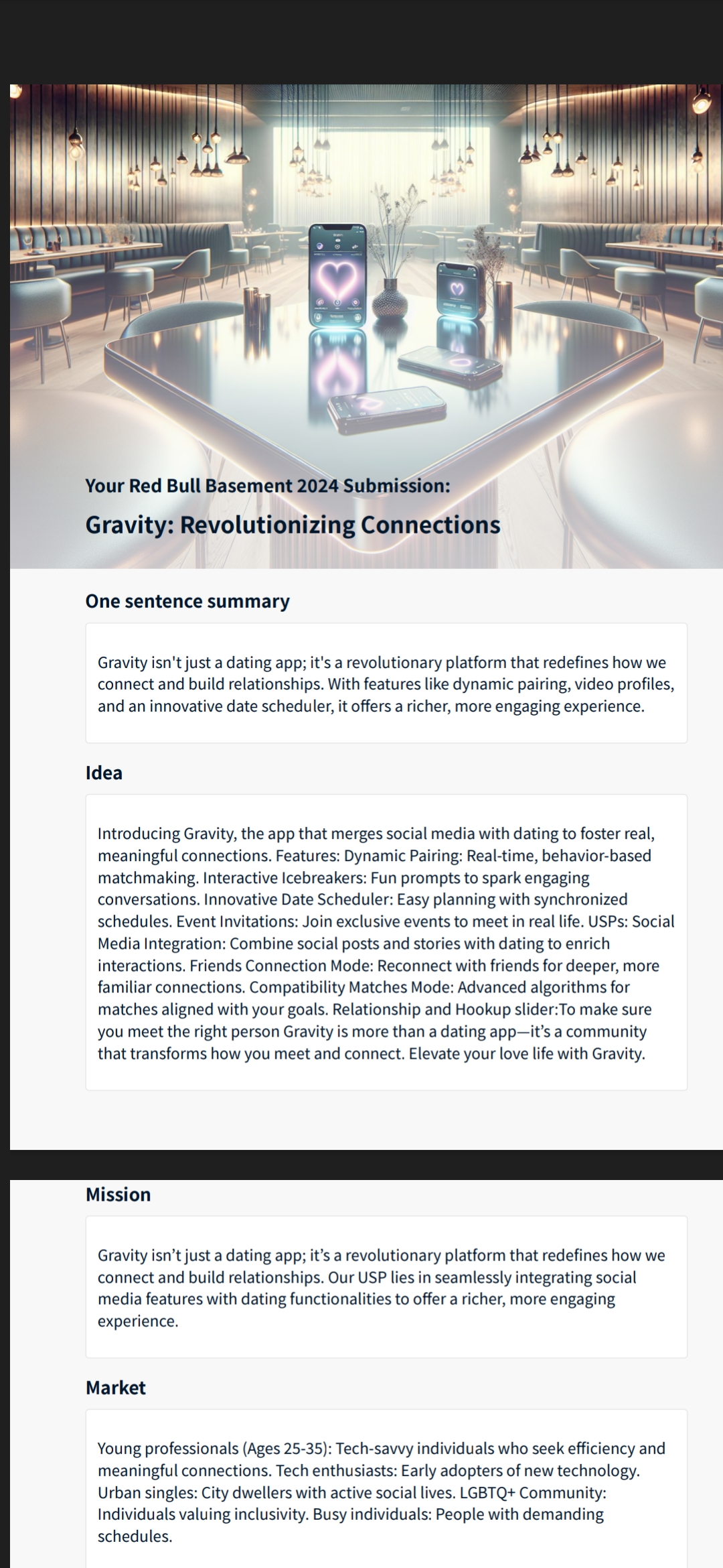 My submission of a Social Media Dating App at the Red bull Basement 2024 ✨ Introducing Gravity: Your New Way to Connect! ✨ Gravity is changing the way we date by combining smart algorithms with social features to create more authentic connections.