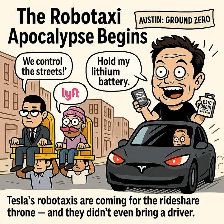 Tesla’s dropping driverless robotaxis in Austin in 2 weeks. No drivers. No mercy. Uber and Lyft are shook — they’ve got their own AV partners lined up (Waymo, Mobileye, etc.) but launches are still months or years away. CEOs say human drivers are toa