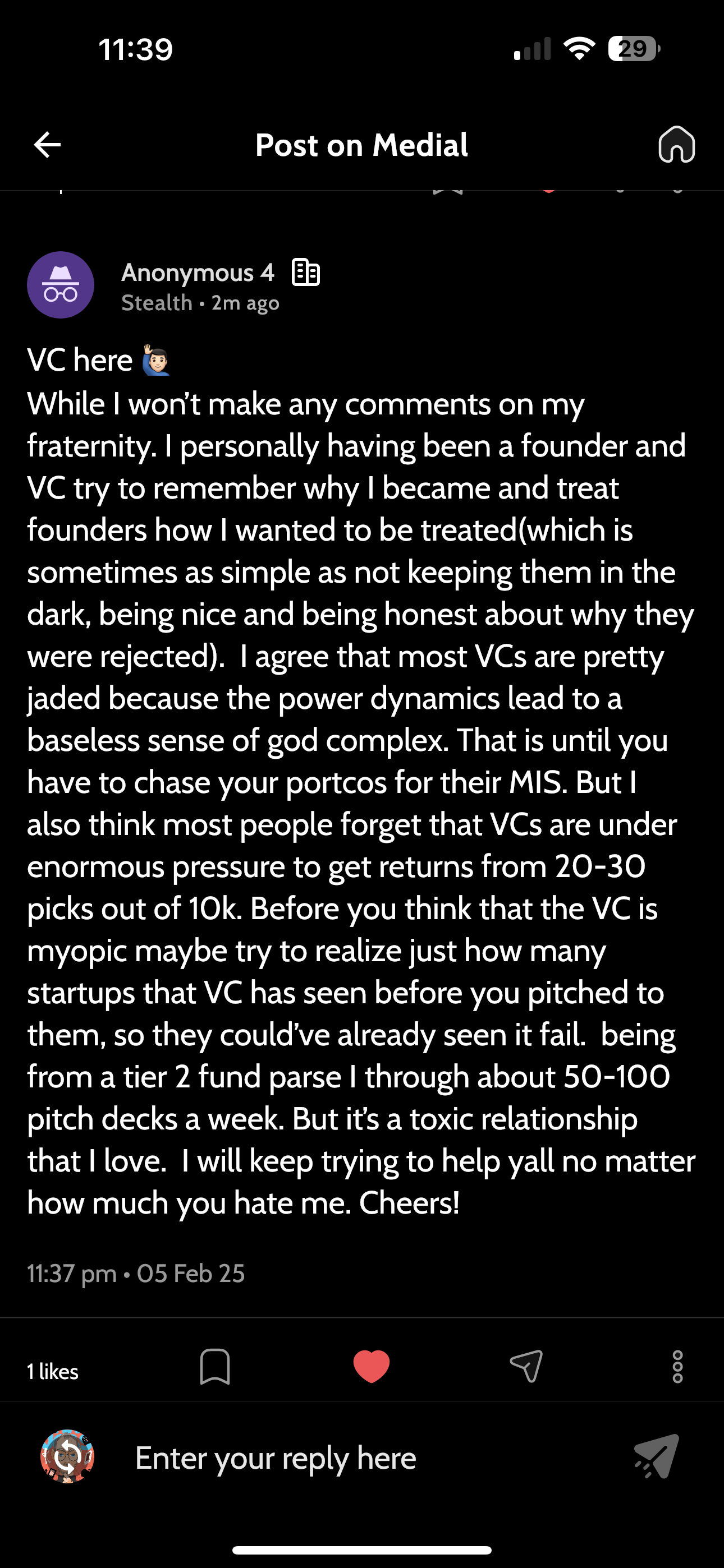 Got this amazing reply from a VC on my last post which was a diss on VCs itself. Respect to him/her for coming up and speaking back with his own POV. Not all VCs have ill intentions 🙌🏻 Also medial, please enable reposting.