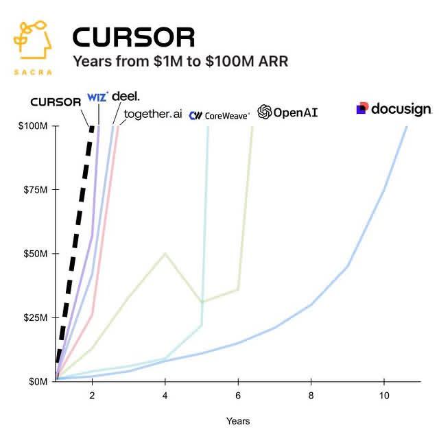 Cursor is now the fastest company to reach 100M in revenue even beating out Wiz. Remains to be seen if this is just a flash in the pan or if AI apps will continue to see this level of success.