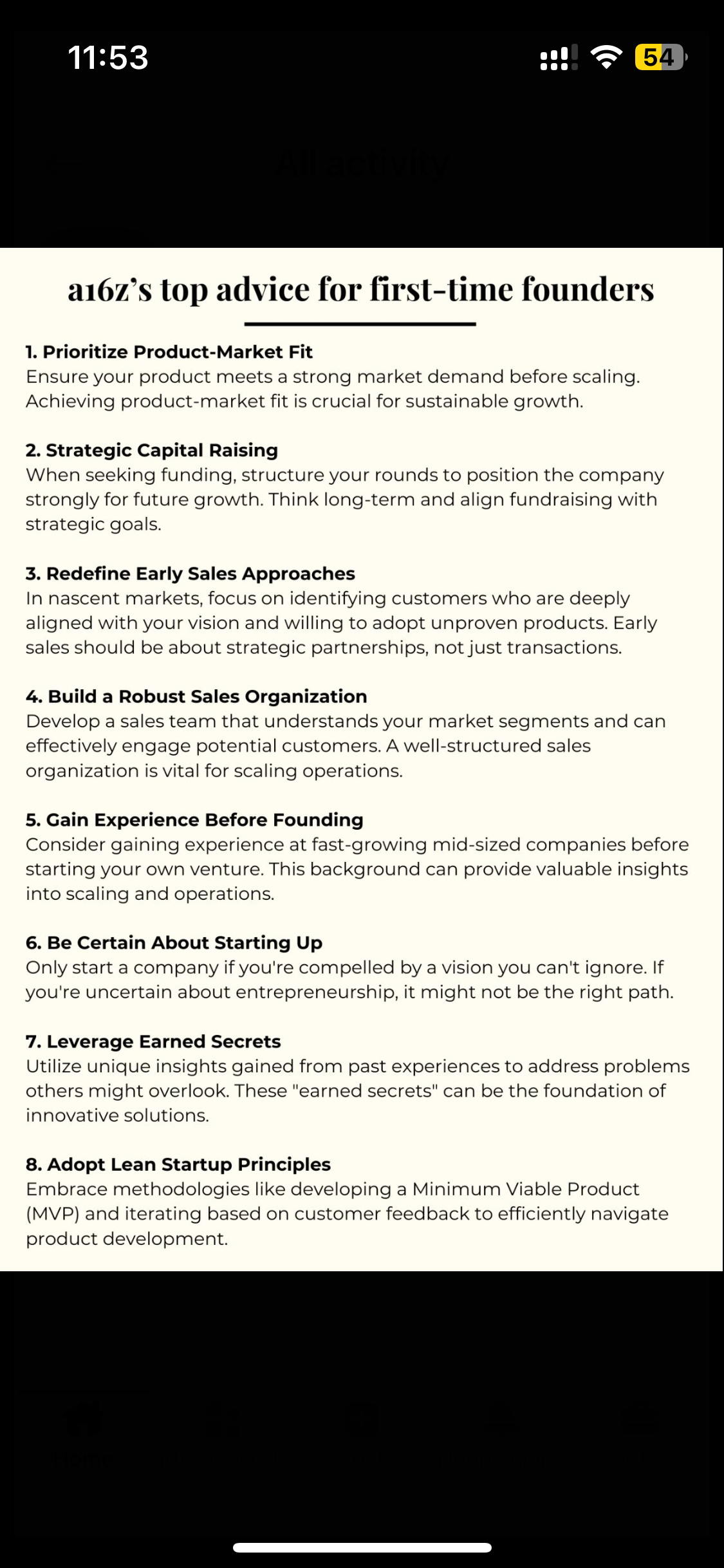 I keep coming back to this list by a16z( Andreessen Horowitz) - itās honestly gold for any first-time founder. āØProduct-Market Fit is non-negotiable, but points like āLeverage Earned Secretsā and āRedefine Early Salesā hit different when youāre actua