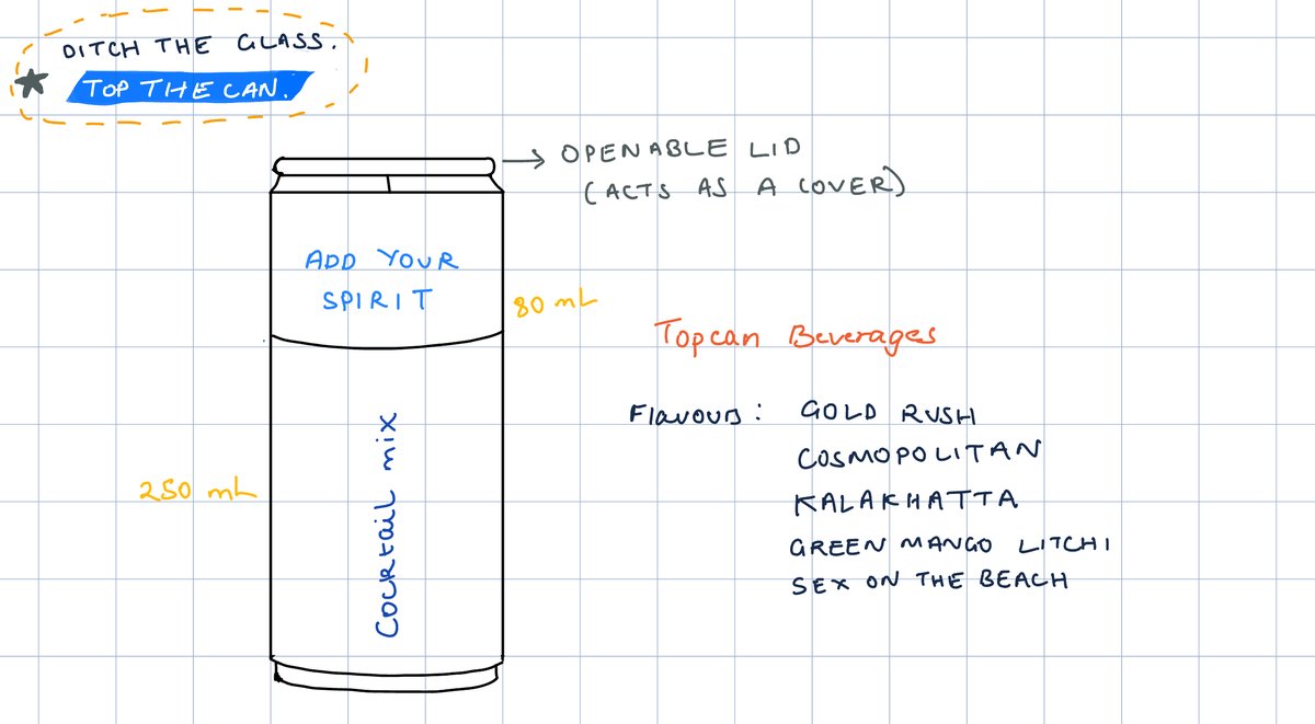 Came across upon a fascinating startup → TopCan Beverages. TopCan is a ready-to-drink cocktail startup, that lets you add your choice of alcohol (unlike pre-mixed cocktails with alcohol). 🔻Problem: Making cocktails are a hassle - Need multiple ingredients and tools - Messy and difficult to clean up - Not everyone knows how to mix a good cocktail - Hard to carry on the go, ingredients unavailability TopCan's Approach ⏬ - 330mL can→ 250mL of pre-mixed cocktail, 80mL space left in the can to add your choice of spirit. - Fully removable lid - The can acts as a glass, with a spill-proof lid for on-the-go convenience ⏭️My perspective→TopCan’s business model seems smarter compared to other alcoholic cocktail startups. By side-stepping alcohol regulations, they can sell in a lot more stores. Also consumers get to choose their preferred spirit.