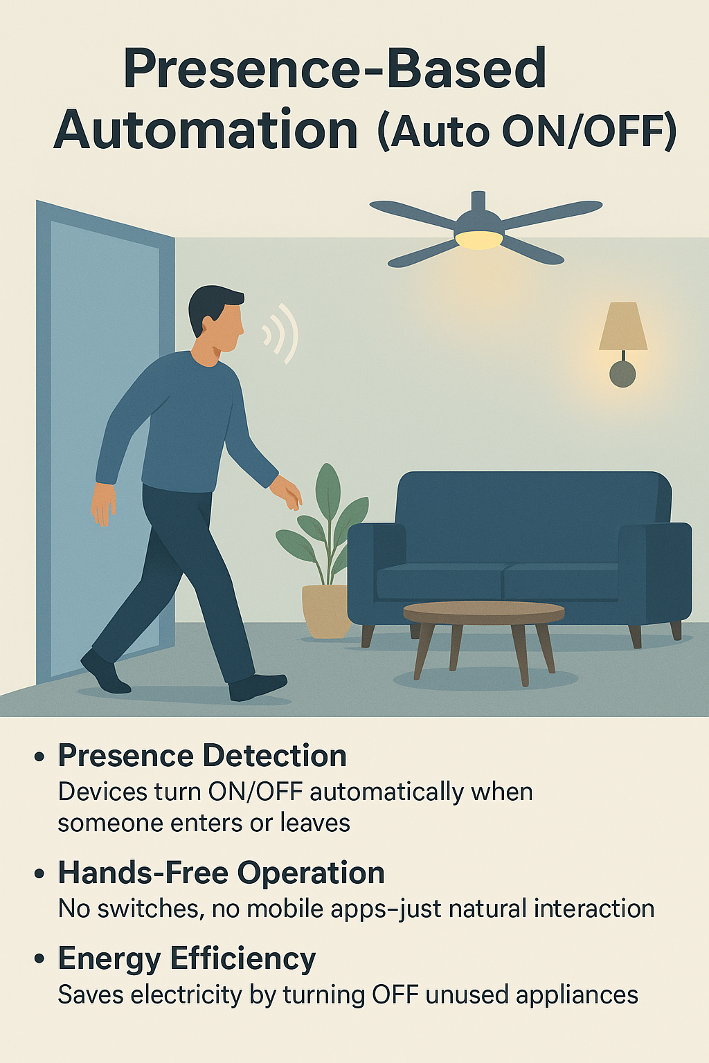 Ab switches aur apps ki zarurat khatam โ ARIS smart automation ke saath lights, fans aur curtains apne aap chalenge. Presence detect hote hi devices ON, aur jab niklo to OFF. Din dhalte hi lights brighten aur curtains close ho jaate hain. Smart livin