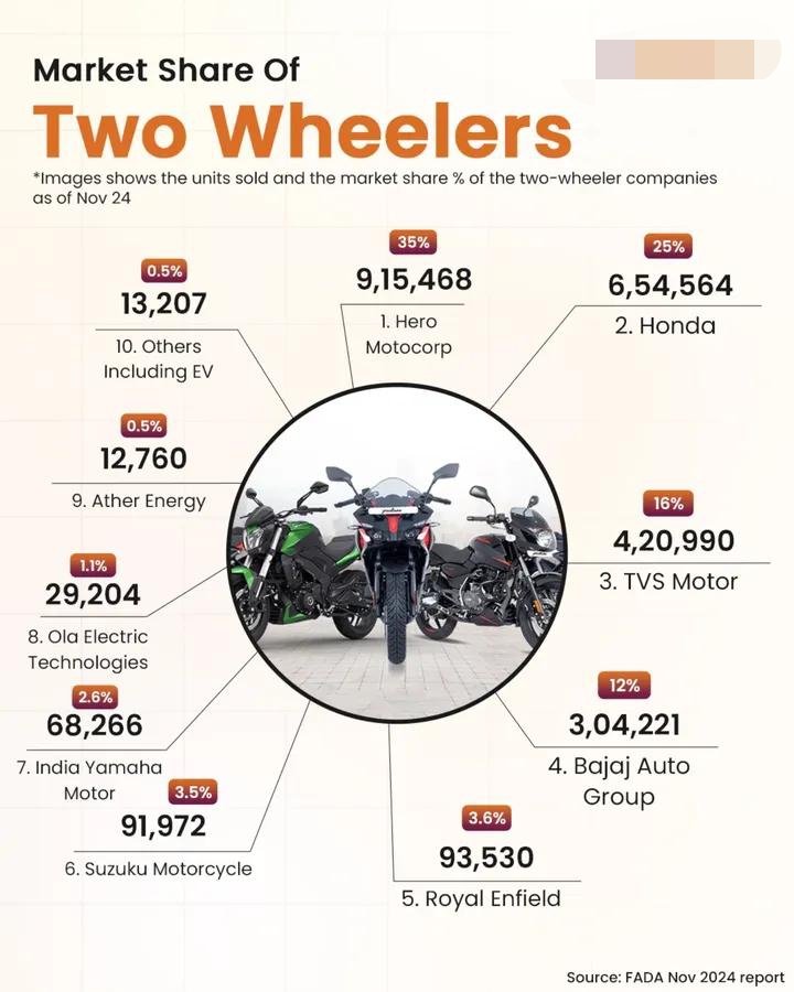 Indian Two-Wheeler Market Insights 🚀 Discover the latest market share stats for two-wheeler companies in India as of Nov 2024!