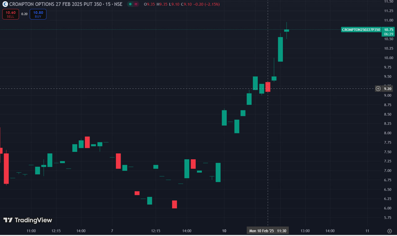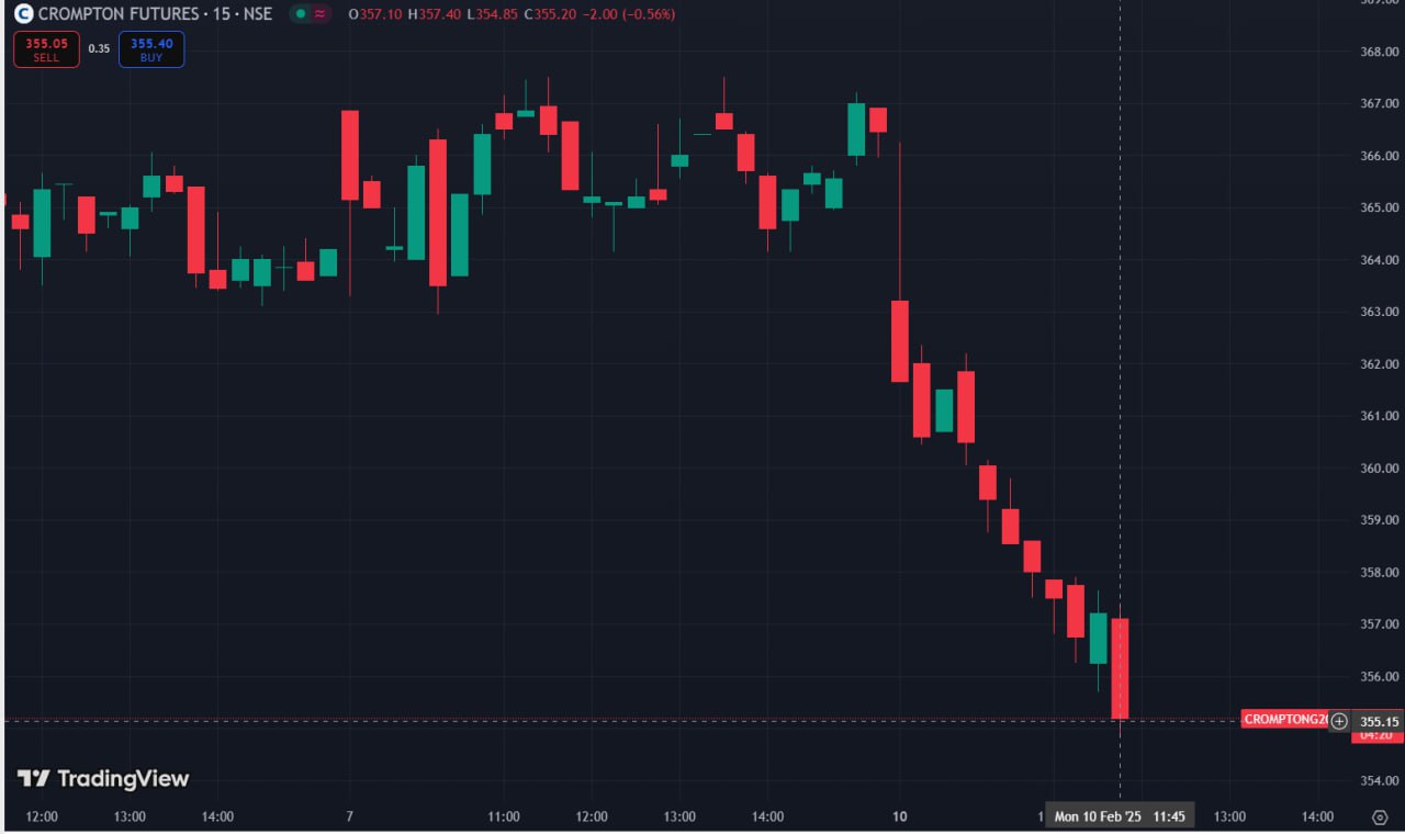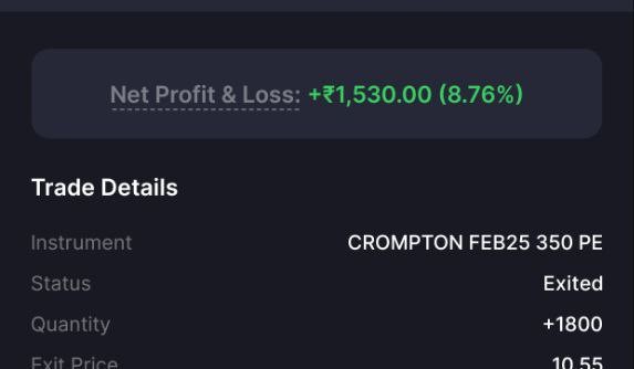 Trading Success Story: Crompton Options Trade Analysis On February 7, 2025, a compelling bearish pattern began forming in Crompton Greaves, signaling a potential opportunity for a well-executed options trade. Utilizing a strategic technical analysis approach, identified this as a high-probability setup. Let’s break down the execution and outcomes. Stock: Crompton Trade Type: Options (Put - 350 Strike Price) Instrument: CROMPTON FEB25 350 PE Entry Price: ₹9.70 Exit Price: ₹10.55 Quantity: 1,800 contracts Margin Used: ₹17,460 Net Profit: ₹1,530 (+8.76%) Market Movement: As predicted, Crompton’s stock declined, causing the put option’s value to rise. The futures chart confirmed the downward momentum, and my strategy delivered solid results. This trade underscores the importance of precision timing and disciplined execution. Technical Analysis Works: Spotting trends early leads to profitable trades. Timely Execution is Key: Entering at the right time and exiting with discipline ensures consistent success. This trade is just one of many! The market is full of opportunities, and I'm constantly scanning for the next big move. Will you be ready for the next setup? Stay tuned—I have another exciting trade set up coming up soon for February 11th 2025! Would love to hear your thoughts—comment below and let’s discuss! 👇