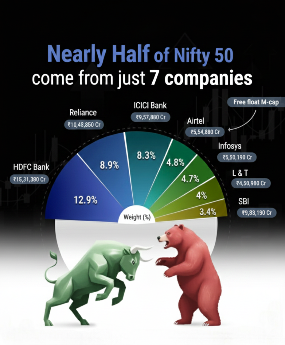 Nearly Half of Nifty 50 = Just 7 Companies! Indiaโs stock market is more concentrated than you think. These 7 giants alone control a massive share of the Nifty 50 index! ๐ผ Top Movers: โญ HDFC Bank โ 12.9% โญ Reliance โ 8.9% โญ ICICI Bank โ 8.3% โญ Air