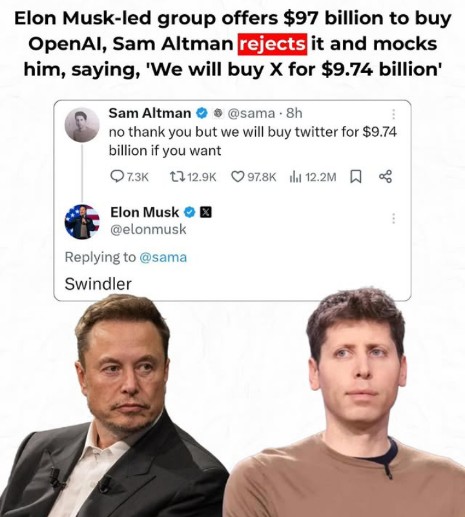 Elon Musk and Sam Altman, co-founders of OpenAI, have recently engaged in a public dispute. Musk led a consortium that offered $97.4 billion to acquire OpenAI, aiming to revert it to its original nonprofit status. Altman rejected the bid and humo