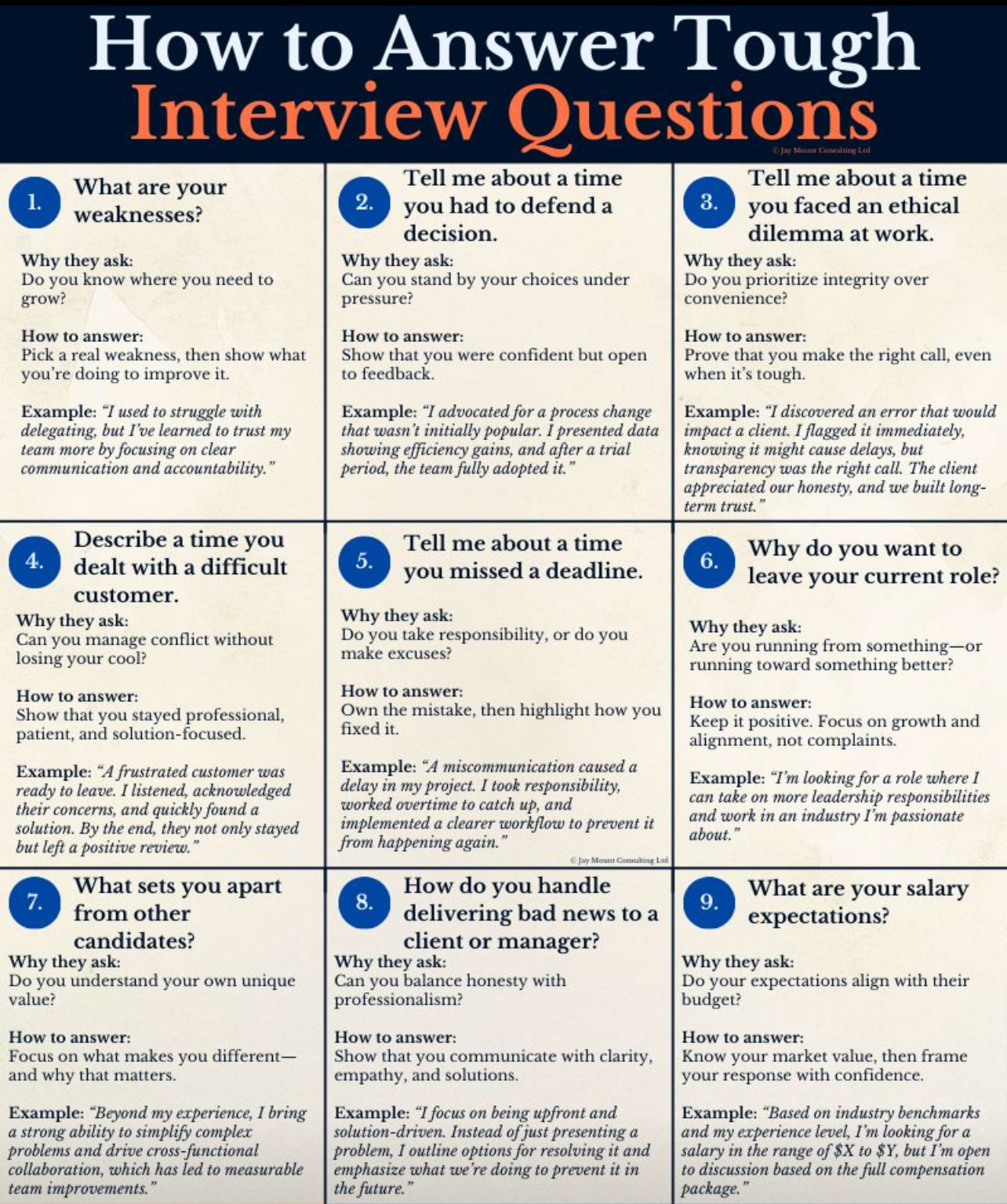 The hardest interview questions arenโt about your skills. They test your character. ๐ Tell me about a time you failed. Why do you want to leave your job? What are your salary expectations? These questions arenโt about catching you off ---- How t