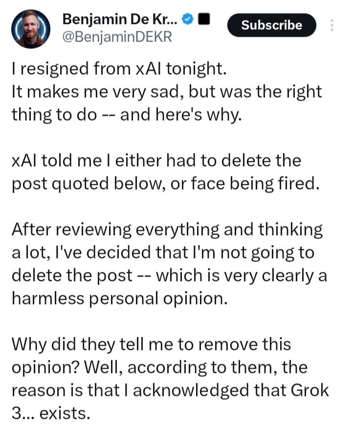An XAi employ fired because he reviewed other Ai. Musk's free speech 😂