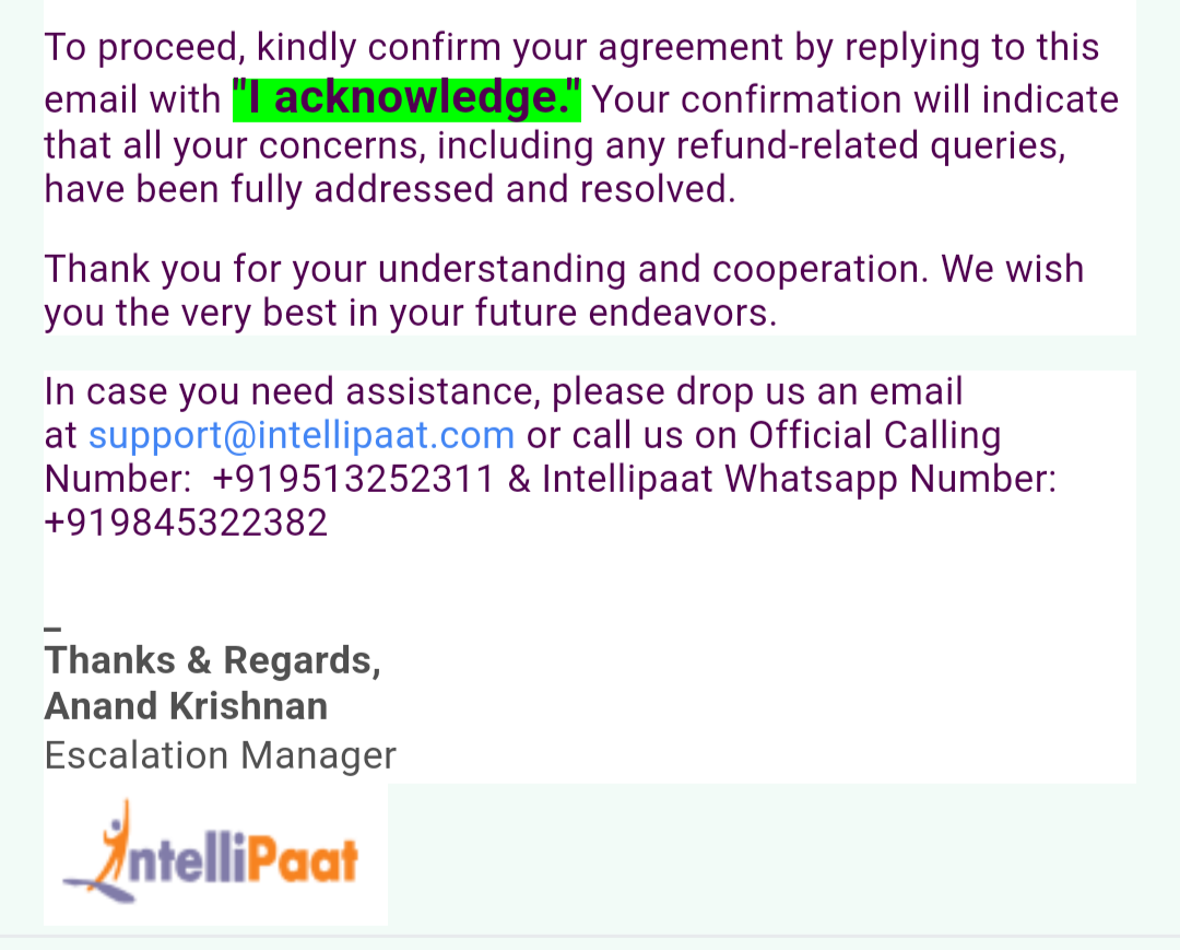There comes the continuation of the Intellipaat company scam and looting rural Indians, Does anyone here are into podcasts or social media influencers do ping me I will share the whole required documents to bring this scam company to light, it wil be a big lesson for scmmers they have asked for the 'I Acknowledge' before settling the loan amount, which they promise to settle before 1st EMI which was bounced and got a bad impression in the bank. what about the CEBIL score, loan company tourcher, loss of identity when the collection agent shouted to repay in front some one home, Earnings loss of 5 L, is it wrong to ask for a compensation or not? what will you do if these things happen to anyone of you? please let me know your taught